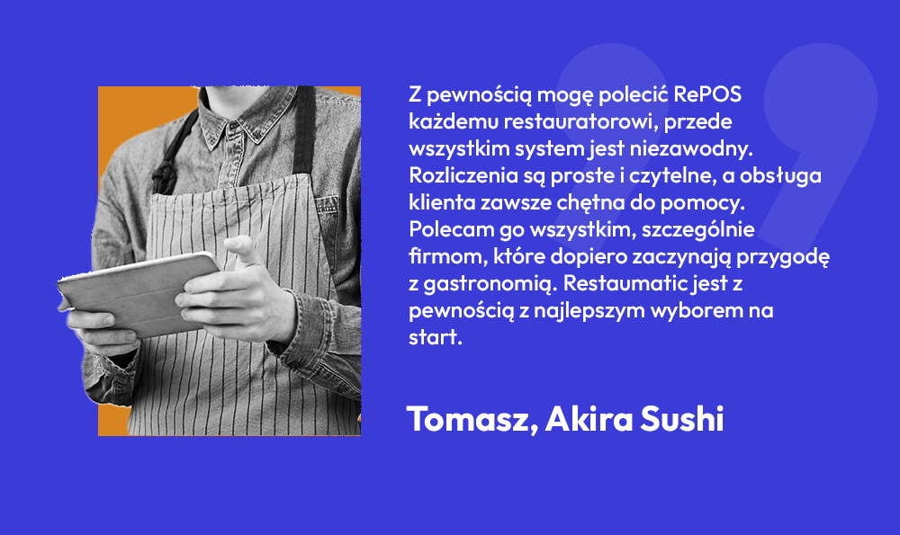 Co powiesz na inwestycję w niezawodnego managera, który przenosi zarządzanie restauracją na Twój telefon lub laptop? RePOS od Restaumatic to partner, który pomoże Ci w obsłudze lokalu, przyjmowaniu i realizacji zamówień stacjonarnych i online, marketingu oraz śledzeniu sprzedaży – a to tylko część jego możliwości. My dostarczamy narzędzia, a Ty gotujesz. Układ idealny!